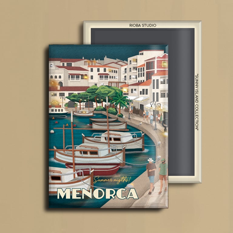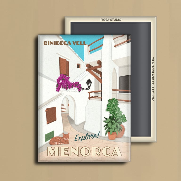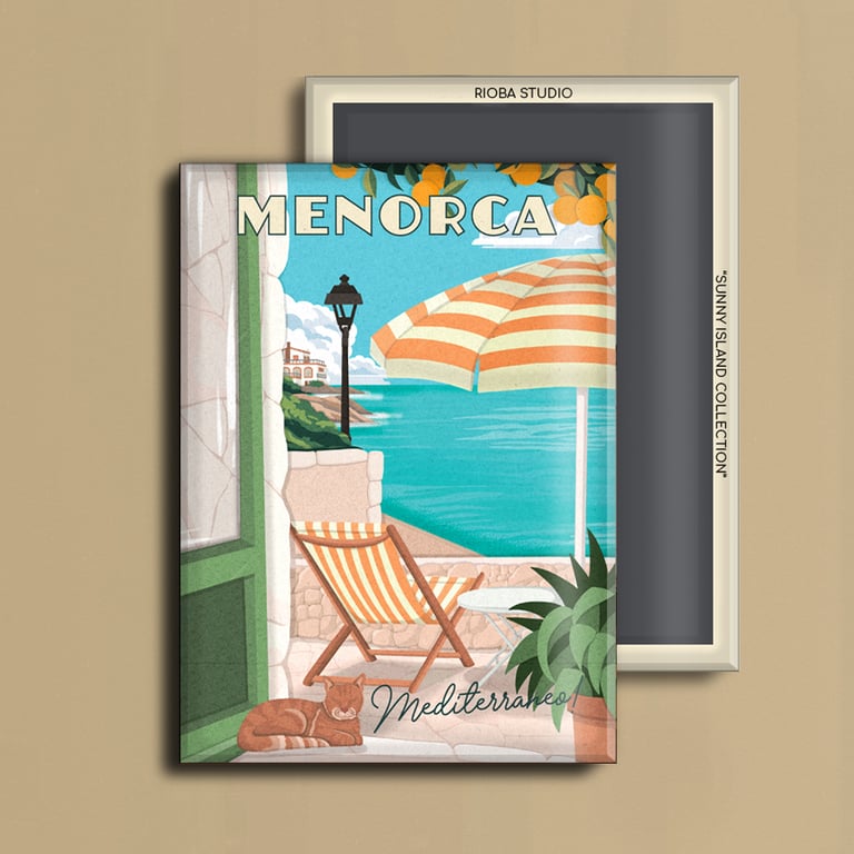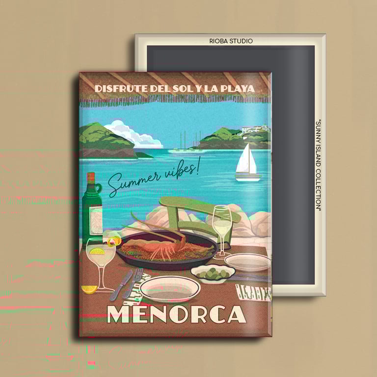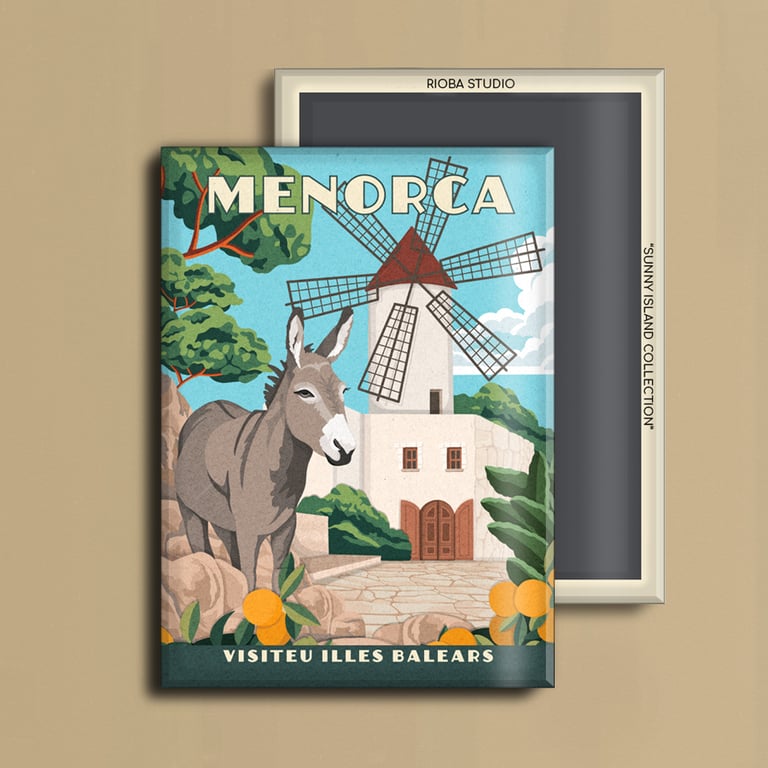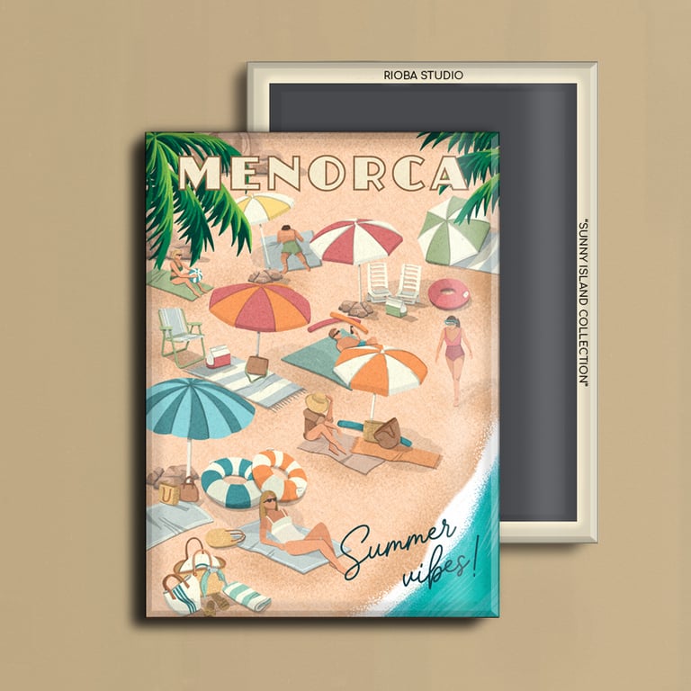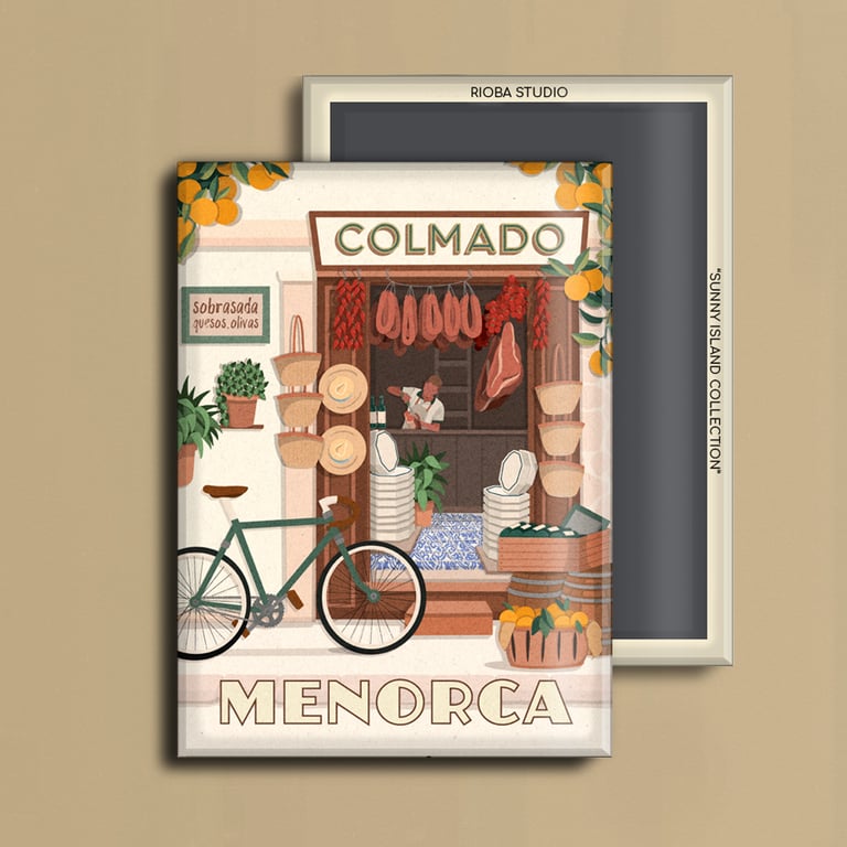 Imán metálico ilustrado para nevera, presentado en packaging con envoltorio OPP. Medida del imán 6,5 × 9 cm y tamaño final del producto 8 × 12 cm, una pieza compacta y cuidada, pensada para conservar como recuerdo.