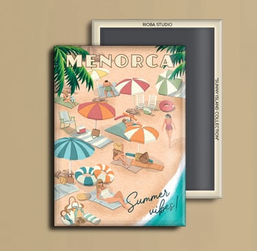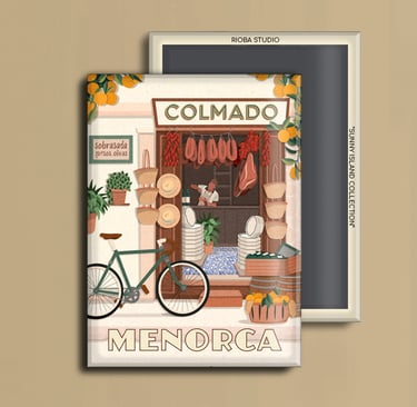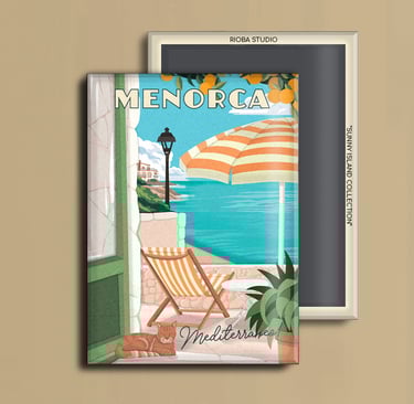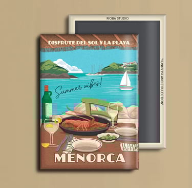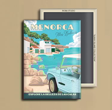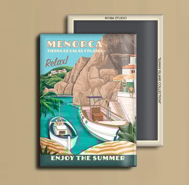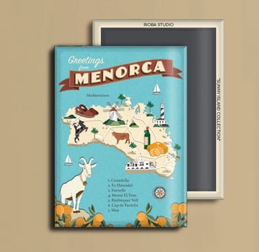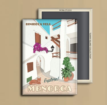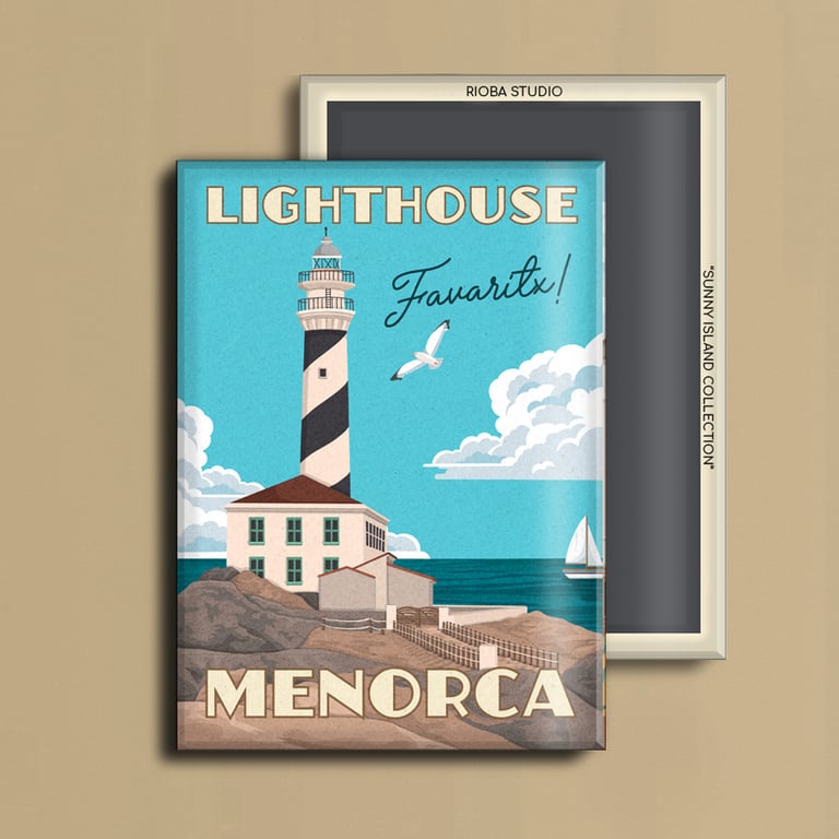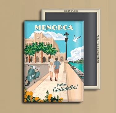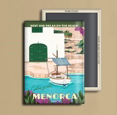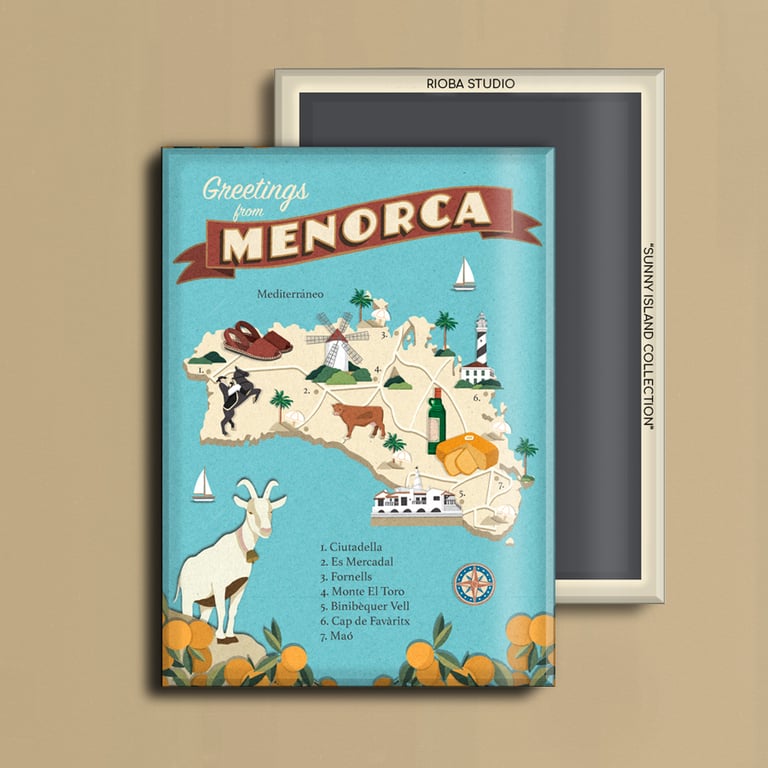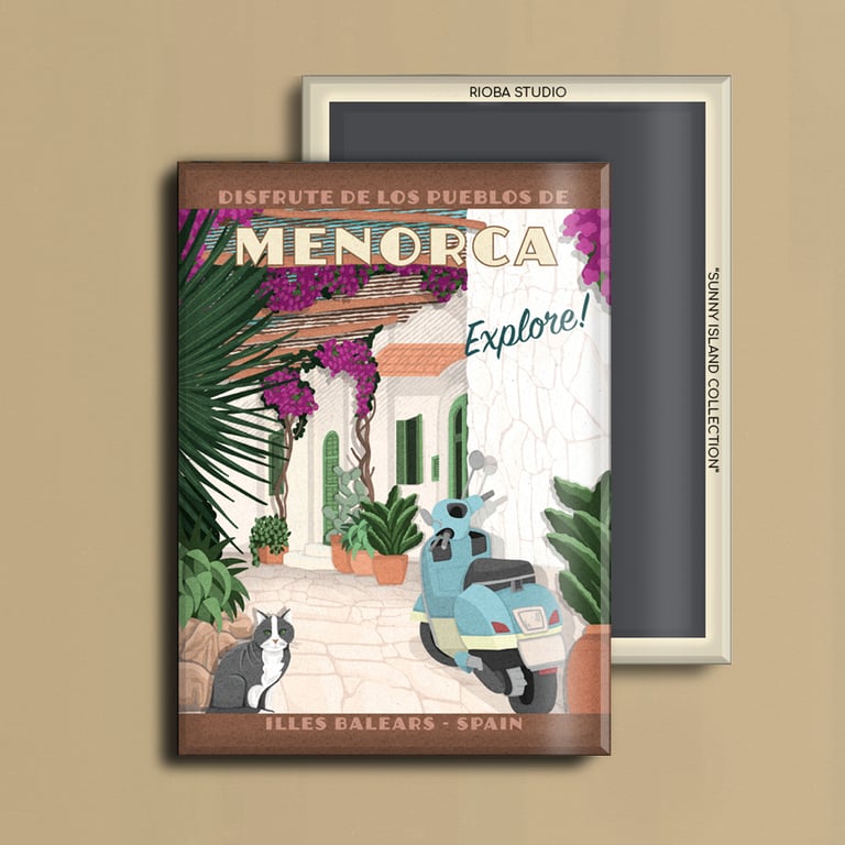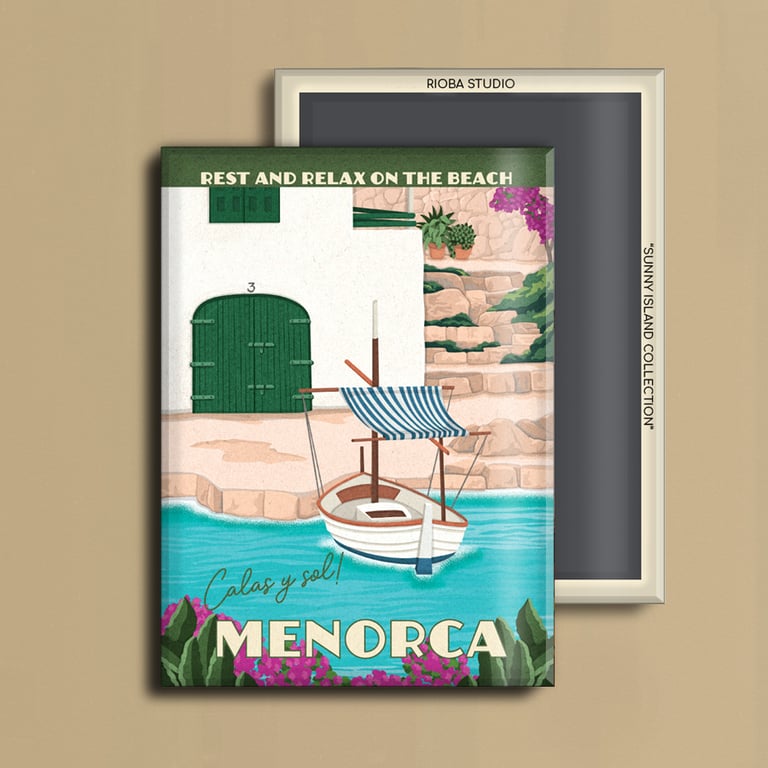 Imán metálico ilustrado para nevera, presentado en packaging con envoltorio OPP. Medida del imán 6,5 × 9 cm y tamaño final del producto 8 × 12 cm, una pieza compacta y cuidada, pensada para conservar como recuerdo.
