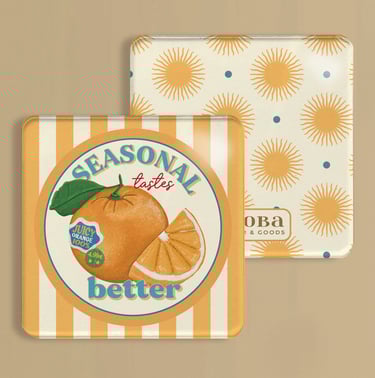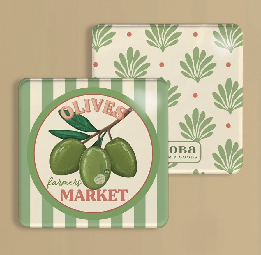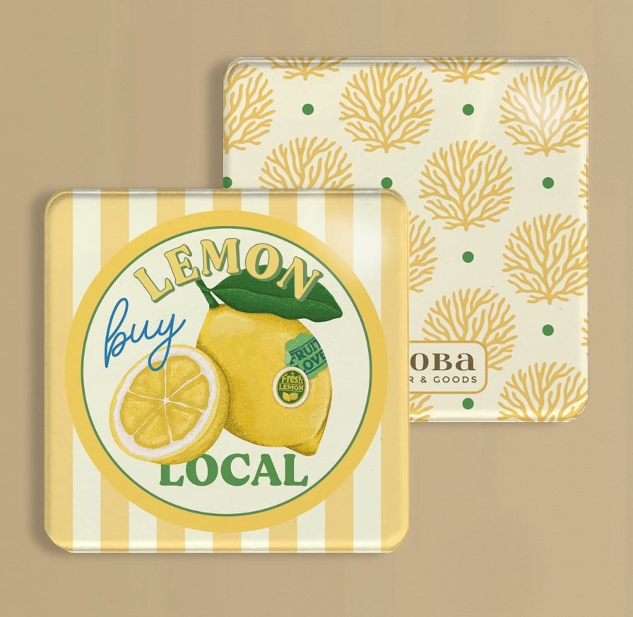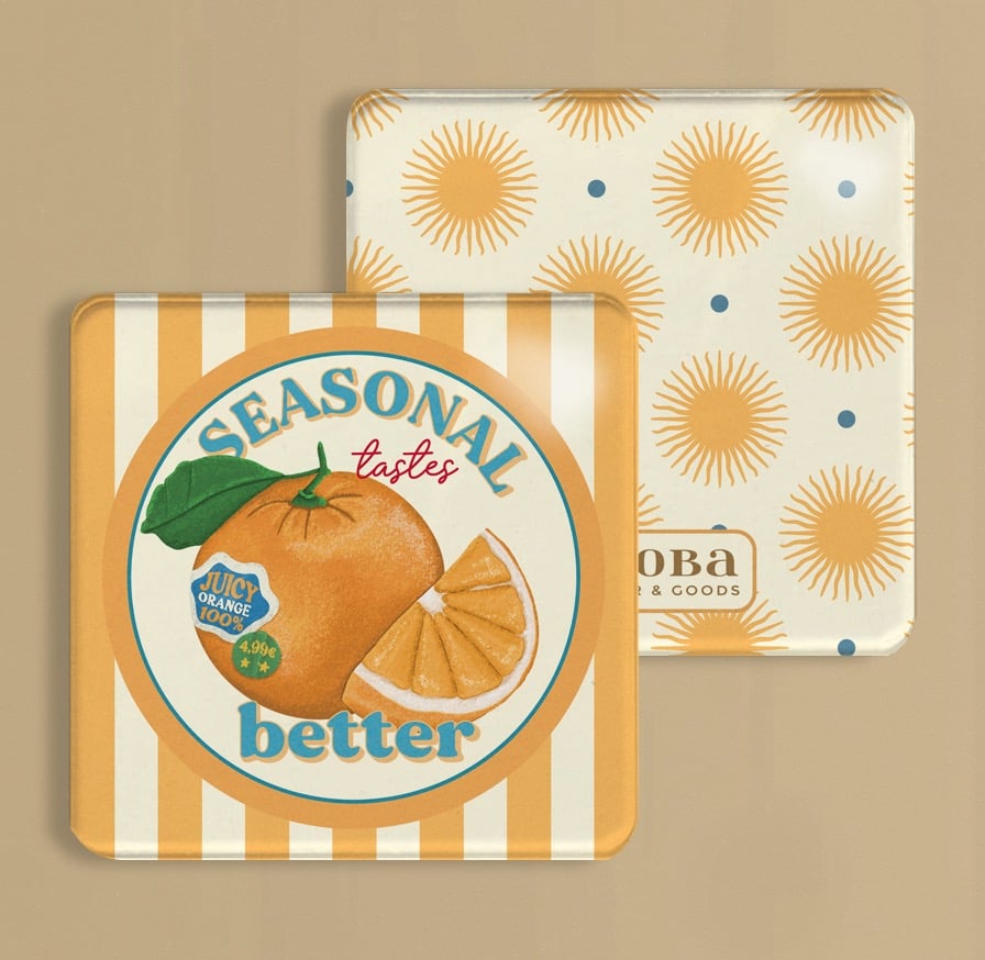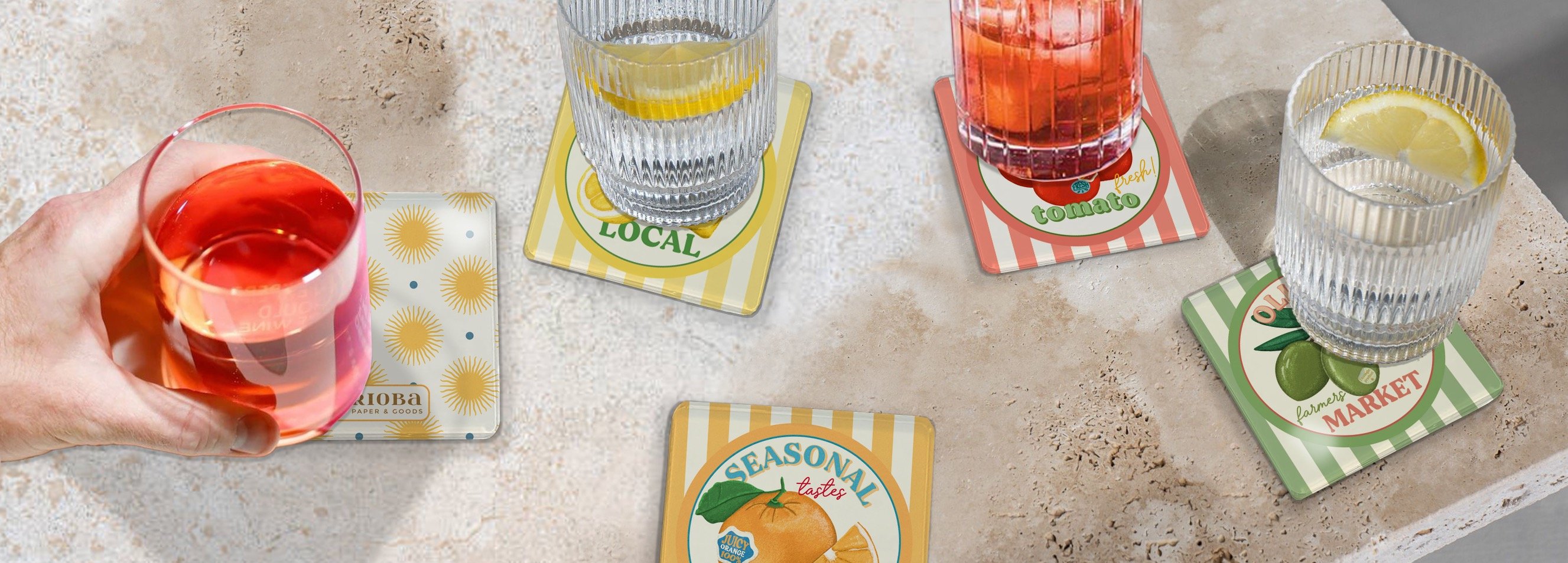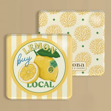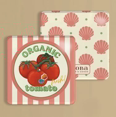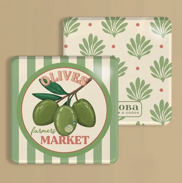 Reversible acrylic coasters with double-sided illustrations. Size: 9.5 × 9.5 cm (3.7 × 3.7 in), designed to protect surfaces while adding a decorative touch to the table.