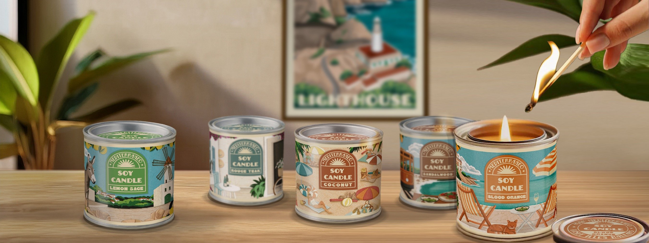 Scented candles made from soy wax, presented in an original mini paint tin can format. Each can features a unique illustration inspired by the nature and architecture of the Balearic Islands. With a content of 80 g (2.82 oz), these candles are designed as a small decorative item, ideal for gifting, collecting, or enjoying in everyday spaces. A product that combines fragrance, design, and Mediterranean identity.
