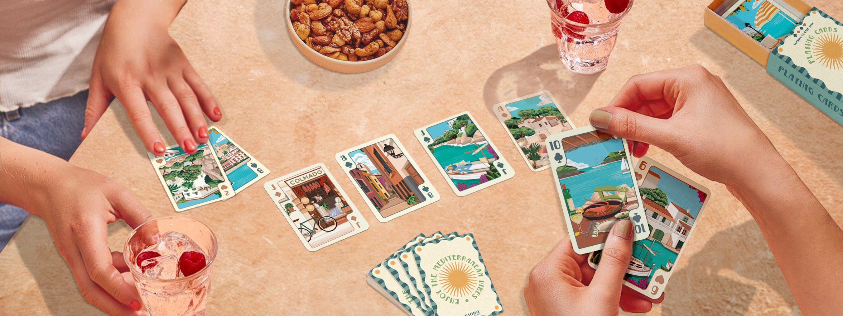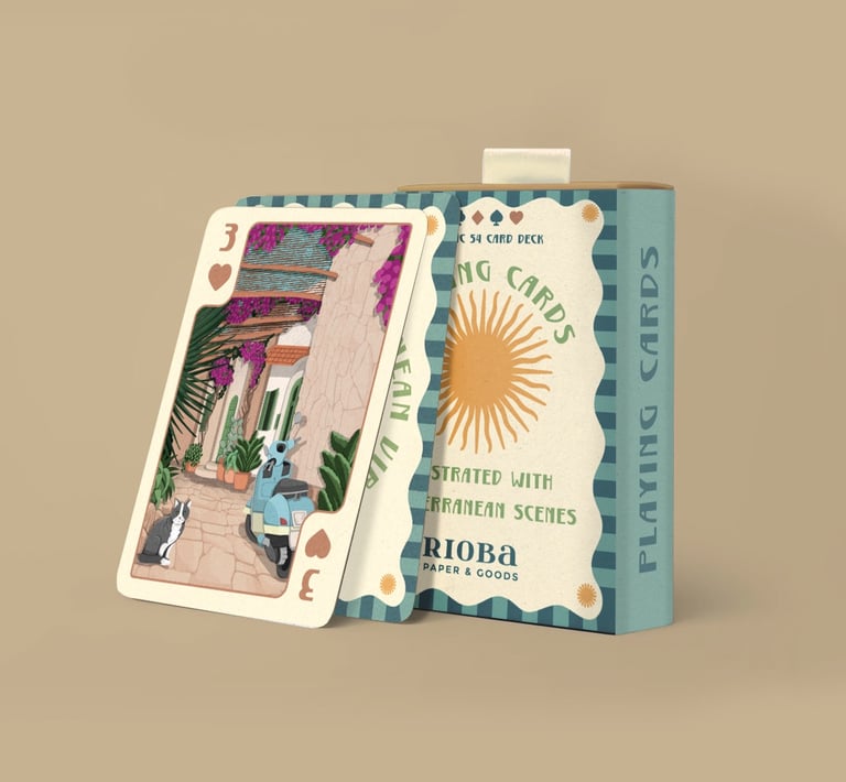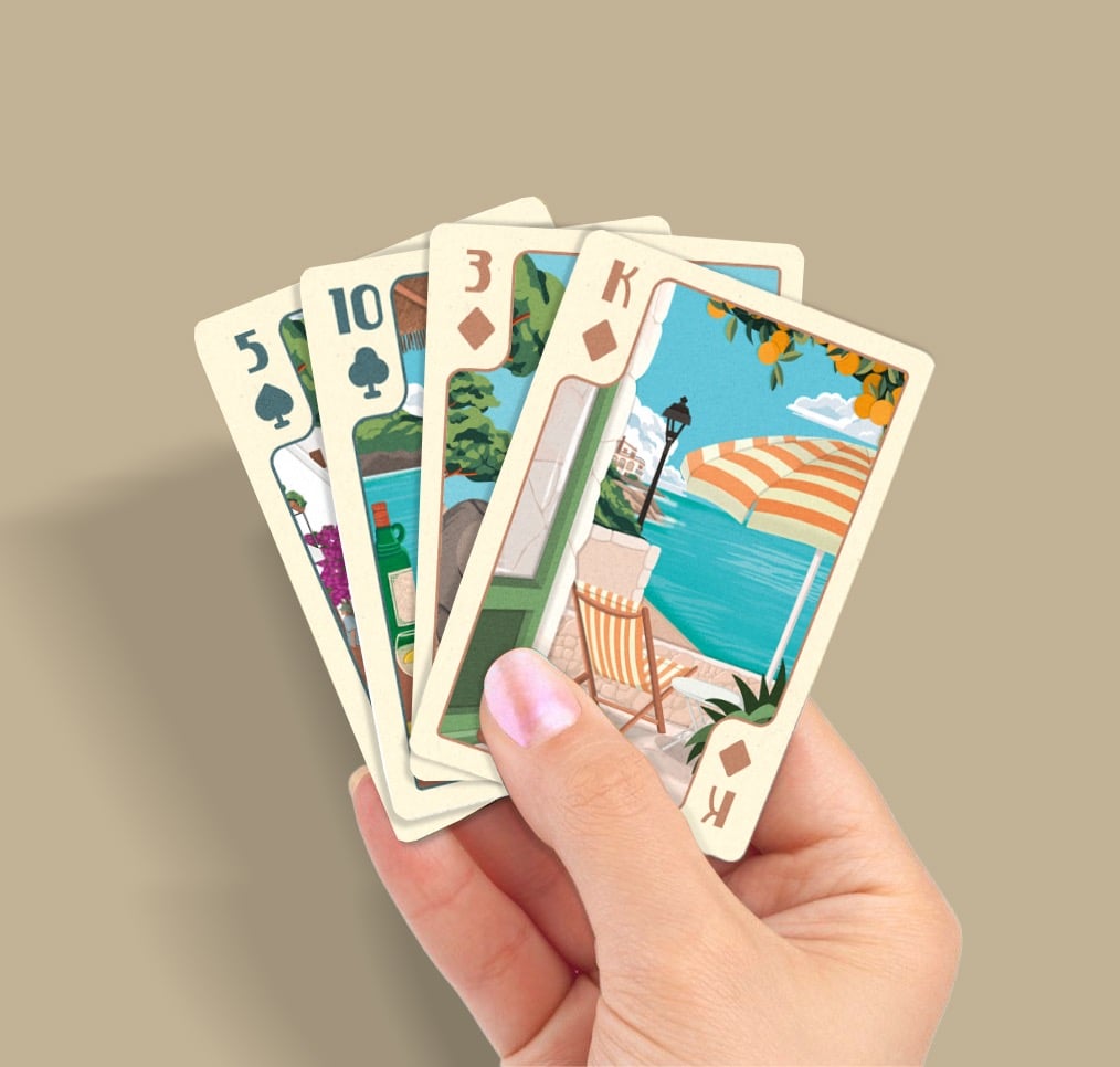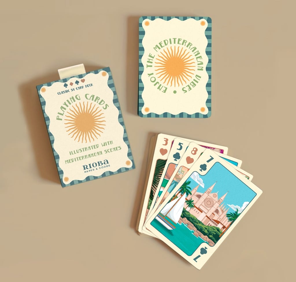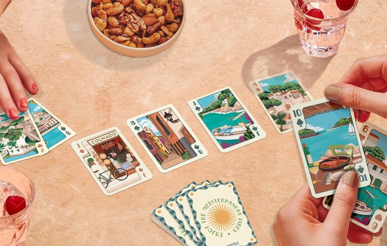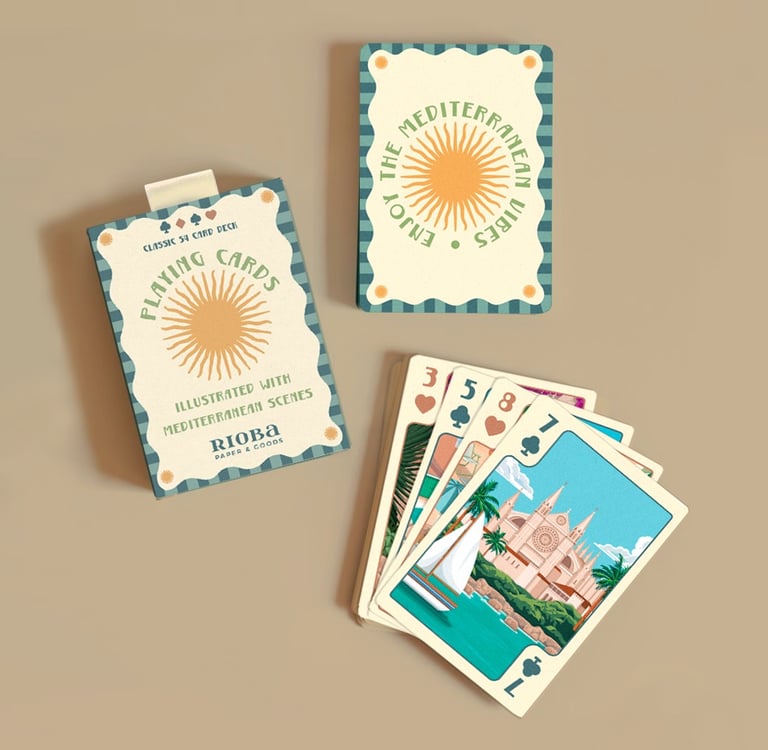 Naipes clásicos ilustrados con motivos de las Islas Baleares, una forma diferente de llevarse un recuerdo funcional del viaje. La baraja incluye 52 cartas más comodines y se presenta en caja rígida deslizante, fácil de transportar y conservar.